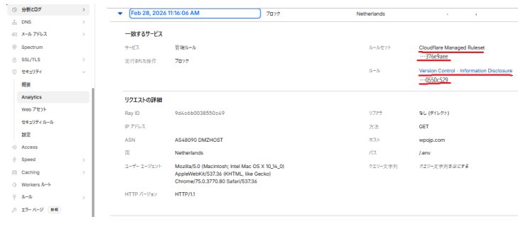 - WordPress保護: wp-config.php などの重要な設定ファイルへの不正アクセス試行。