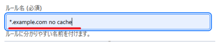 設定例: https://*.example.com/files/* をキャッシュしたくない場合 フィールドを URI Full、演算子を 一致する (wildcard)、値を https://*.example.com/files/* とします。