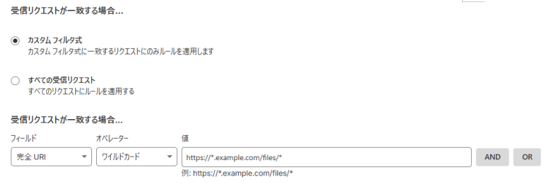 受信リクエストが一致する場合: 「カスタムフィルター式」を選択